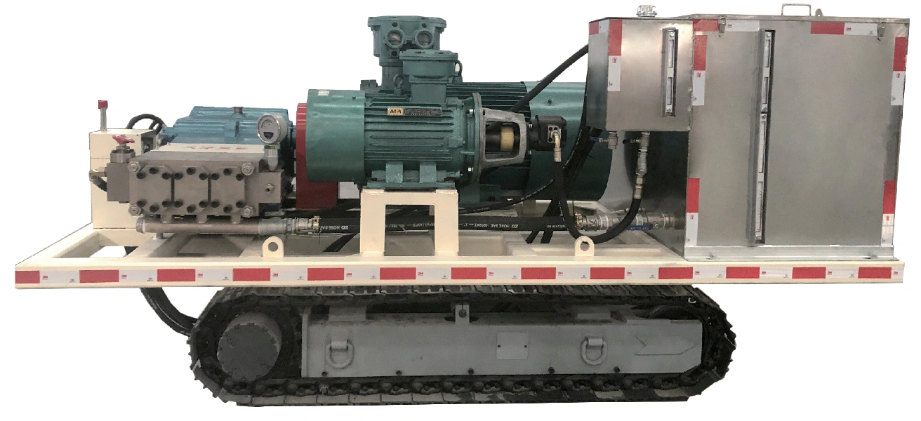 The water injection pump station uses standard Juneng water injection pumps and features a crawler-type traction mechanism, making it suitable for mobile operation within mine roadways. The traction system employs an independently installed hydraulic oil pump, which drives a hydraulic motor via a directional valve to enable forward and backward movement as well as turning, while providing a certain level of climbing capability. The pump station is also equipped with a transition water tank and a hydraulic oil tank.